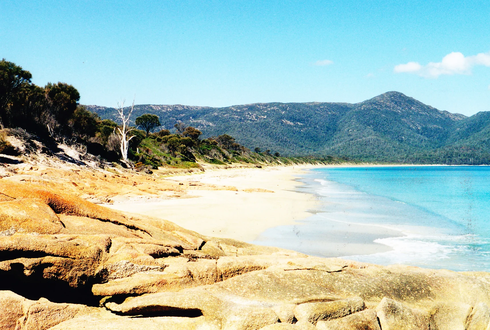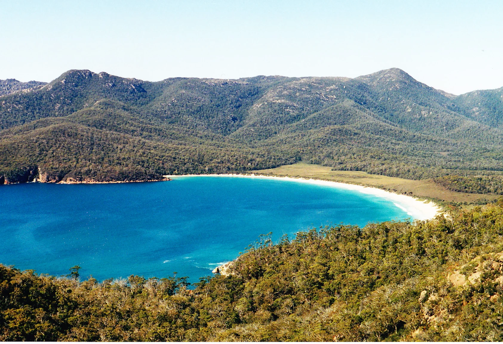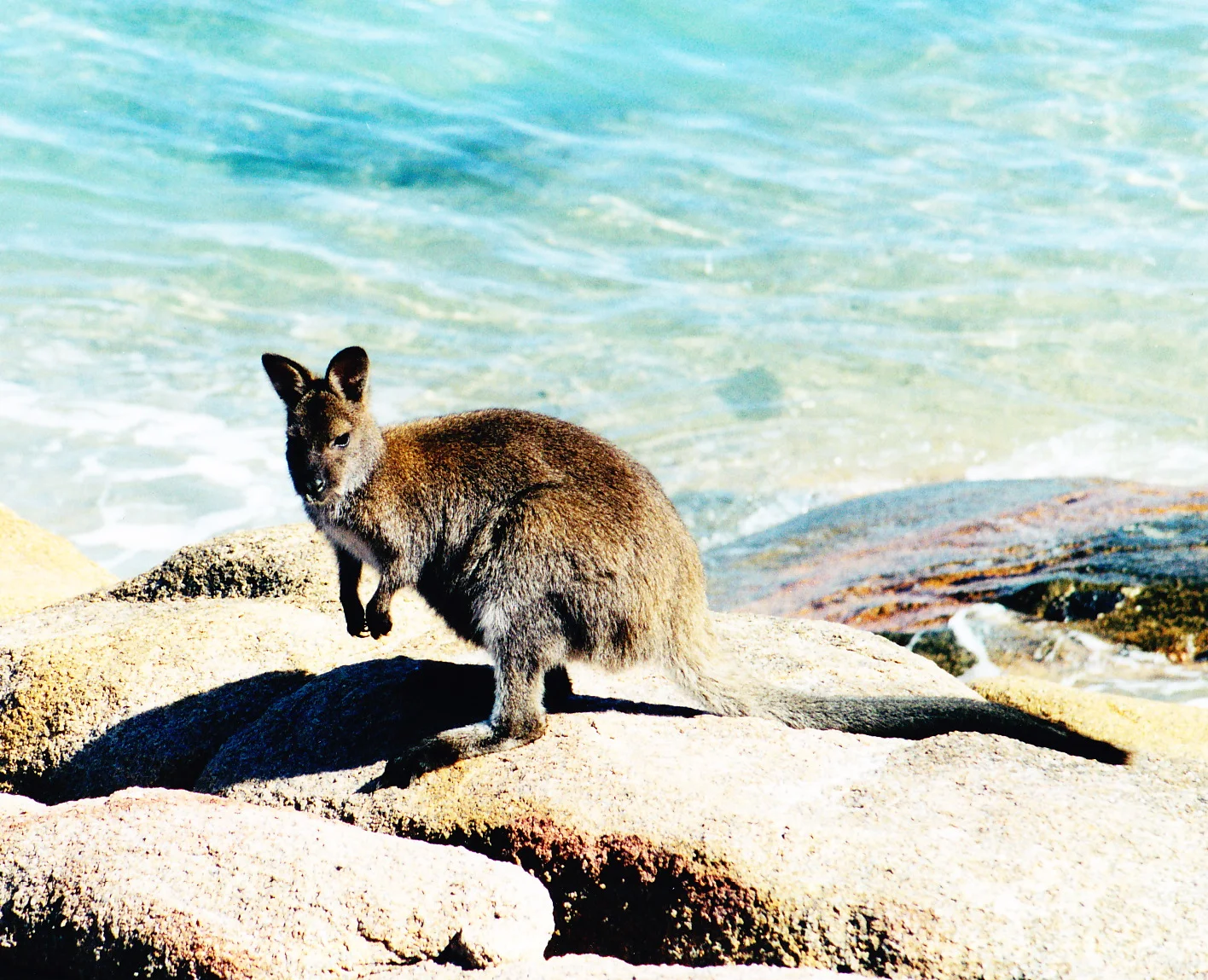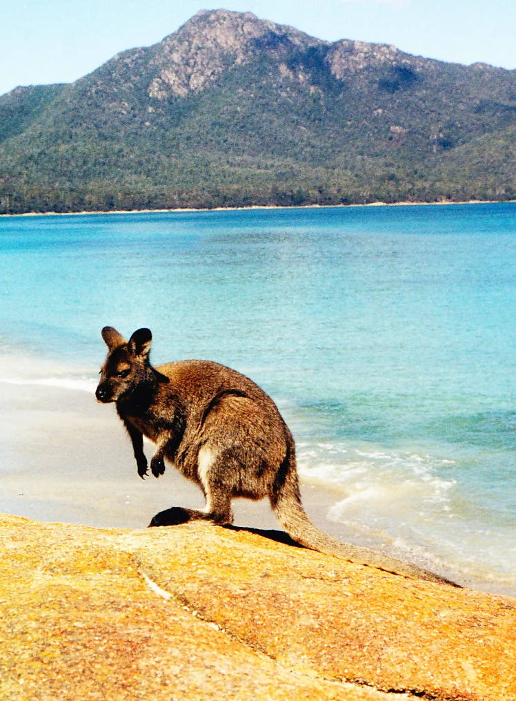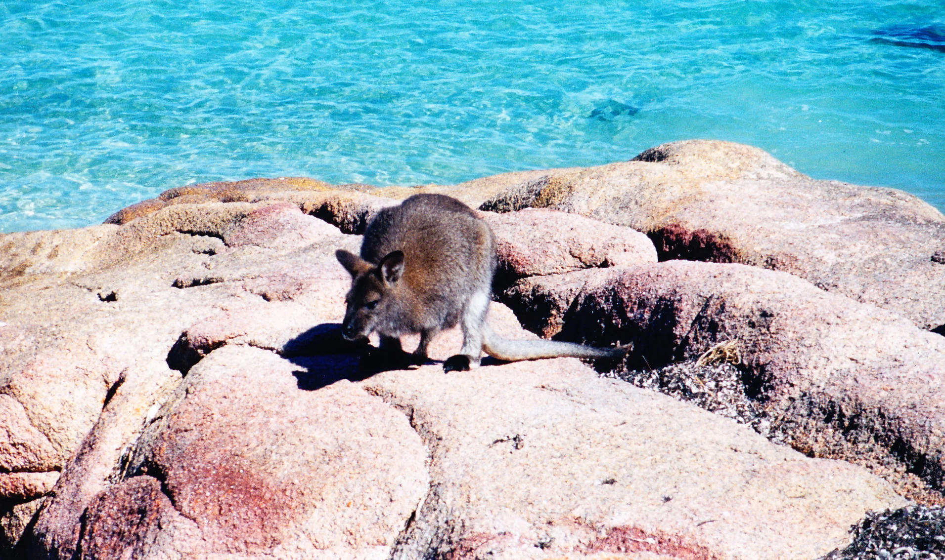 But I did get up early and pick up the rental car and then headed north along the coast. The weather was nice and the driving fairly easy. My destination? Freycinet National Park. When I had been in Melbourne, I had found this Tasmania information store and had picked up a brochure on the 50 Great Short Walks in Tasmania. So that was my goal at Freycinet. I arrived there around 11 and parked the car at the trailhead. Since it was so nice, I changed into a singlet (sorry that’s Aussie for tank top) and decided to ditch my backpack and just carry my camera. So off I started, up the hill. Freycinet is on a peninsula that pretty much points south. There are two large mountains, called the Hazards, on the peninsula separated by a low-lying isthmus. My walk was to climb the first Hazard. The hike was good and the trail in great condition. Up and up I went for about 30 minutes where I was then rewarded with a spectacular view of Wineglass Bay. It's this perfectly shaped crescent bay with gorgeous white sandy beaches. It was just amazing, and where I was going next. Down the mountain I went through a variety of eucalyptus trees and low growing shrubs. It was nice and warm by the time I could hear the pounding surf and I emerged from the forest onto the beach. There were maybe 20 people here and it was just so nice. Wineglass Bay is on the ocean side and the surf was pretty intense. Very decent size waves that kept crashing onto the beach. The water looked really inviting, but the surf was a bit intimidating, so I decided to continue my walk and see if Hazard Beach might be a better place for a swim. Crossing the isthmus was pretty easy. Again the walk took me through these huge trees and all sorts of shrubs. And I'm walking by myself with no one around so it seems like I'm the only person there. I left the forest and then climbed a sand dune and then came down onto Hazard Beach. Where wineglass bay beach was white, hazard beach was almond color and just as beautiful. The water was calm and so blue and clear. It just looked inviting. So I wandered down the beach a bit. I wanted to swim, but the water was a bit cold. But as I walked along the edge of the beach with my feet in the water, I sort of got acclimatized and was definitely ready for a swim. Okay, now I have issues. Do I swim au naturale or in my skivvies? There are people nearby, so au naturale is not a good option. Swimming in my skivvies means either wet underwear on the walk back (another 2 hours) and that could be very painful or I could go commando. Well I get to the end of the beach and there is a rock jutting into the water and I climb that to get a better view and then sit and think about myoptions. Now as I'm sitting there, a wallaby jumps out of the scrub growth scaring the s$%t out of me. It's no more than 12 feet away and has absolutely no interest in me. Of course, I've got my camera out and snapping like 20 pictures. It was really cute and really didn't care if I was there or not. After my photo op, the wallaby just hung around and I went back to my swimming dilemma. Now on the other side of my rock was a small little crevice/valley before the next big rock. But this little crevice had a sandy access to the water, so I decided to go for it. So I stripped down to my skivvies (what were you thinking?) and jumped into the water. Okay, when diving into sea water wearing boxer briefs (sorry if it's all TMI {too much information}, but deal) it is imperative to hold onto your shorts. I almost lost my "suit". The water wasawesome though. It was sunny out and the water was clear and it was just the best time. I'm not sure how it is with you, but there are certain times that I just feel good, alive, and happy, like the universe is right for just a short span of time and I wish I could tape record that moment and relive it over and over again. And those moments don't come often, so you want to treasure them when they do. It was one of those times. I was swimming in the crystal clear and cool waters off a perfect sandy and nearly deserted beach while a wallaby watched my clothes. And I was just happy. Could it get any better? No. Eventually the wallaby wandered off and after about 20 minutes, I decided to head back in. I quickly got back into my clothes, yes commando, and hiked back to the trailhead. The return hike was good and I was pretty tired and thirsty by the time I got to the car. I drove to a small town called Swansea on the coast where I had reservations and then showered off the saltwater before heading out of a great fish dinner at a local restaurant.