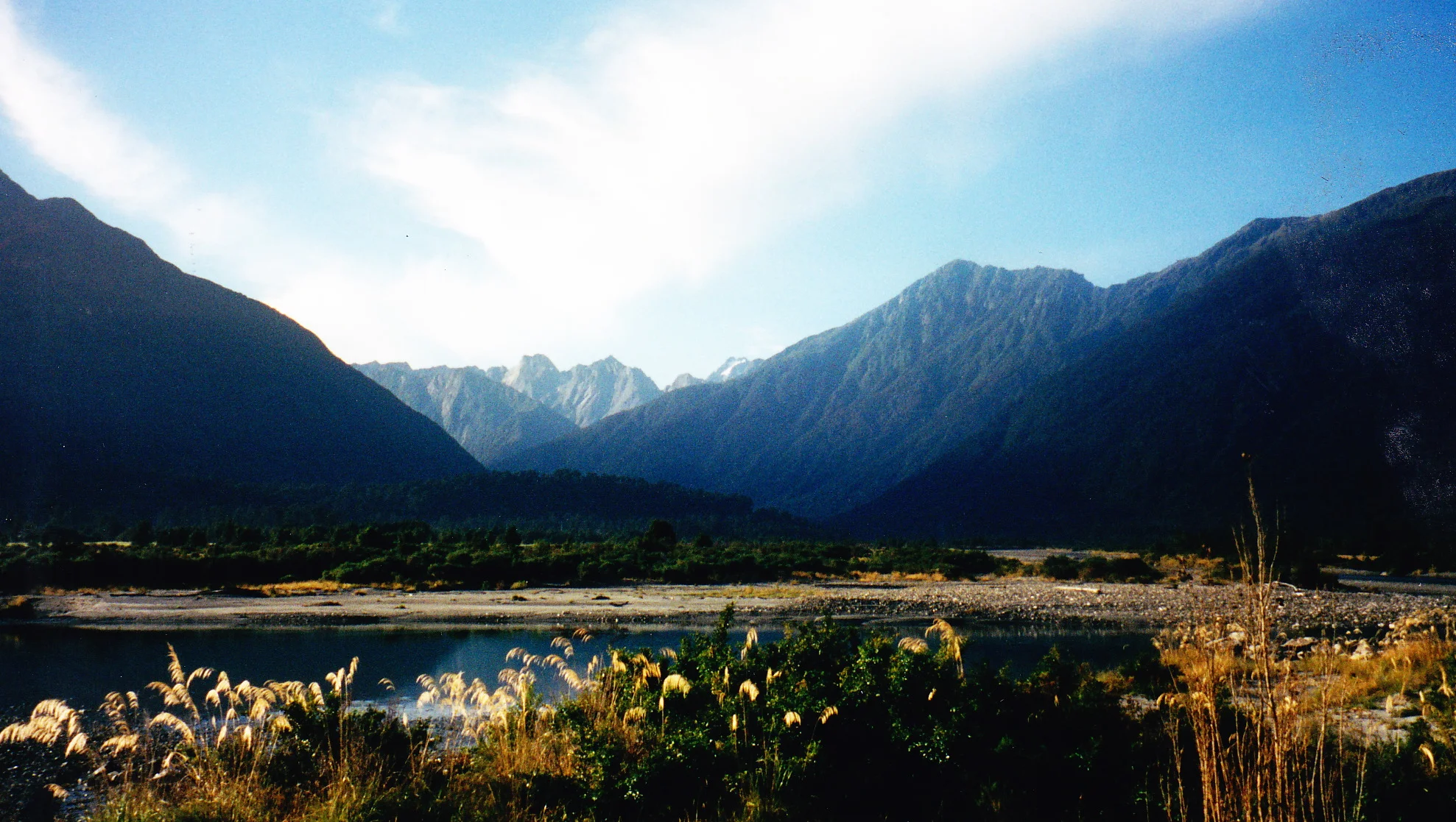 I left Moteuka the day before yesterday (when you are on holiday, days/dates don't really mean much!). Moteuka is up in northern part of the South Island. It was really pretty there and actually reminded me of Sonoma. The Marlborough region is famous for its wines and I have been sampling some very good Rieslings and gewürztraminers. Anyways, it was very dry up there and it was considered an extreme fire hazard. I headed south planning to cross over to the west coast. The road was pretty curvy and I was starting to feel a bit queasy, but the scenery was fantastic. Once I crested the mountains that run down the South Island, I found myself in Buller's Gorge going toward the coast following the river. Once on the other side of the mountains, the climate changed dramatically. Now it was all lush green trees and raging rivers. Very nice.
