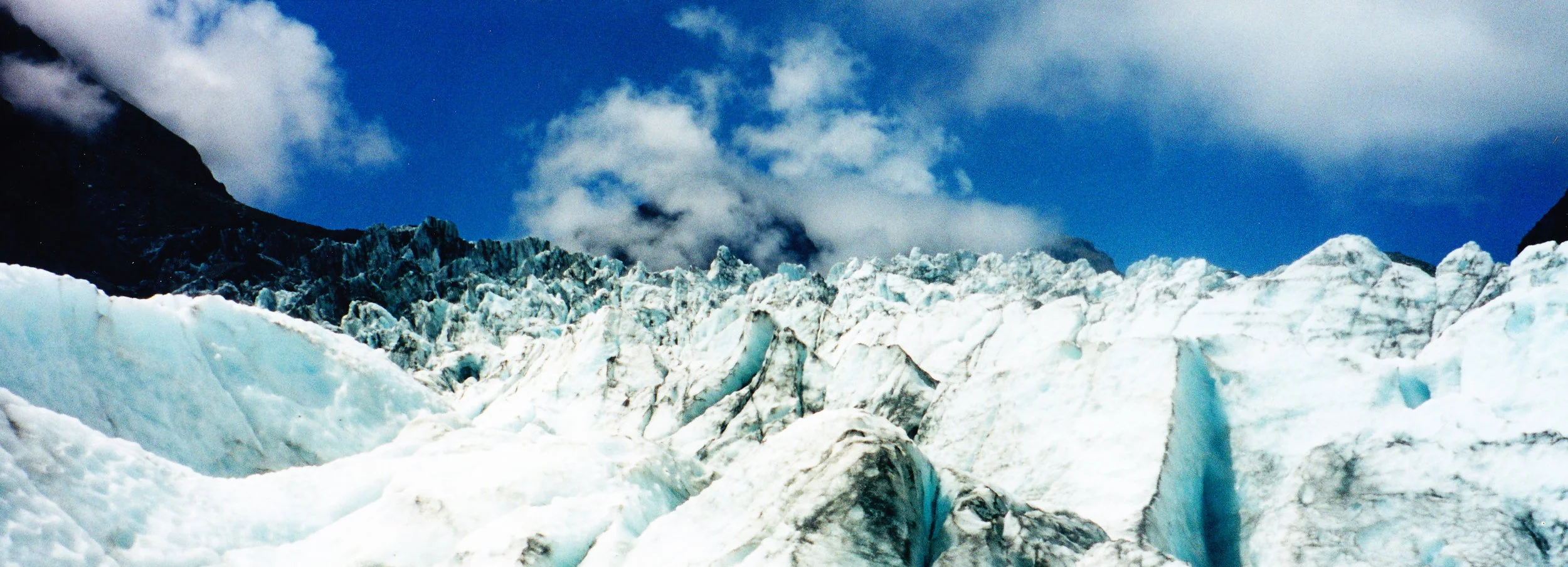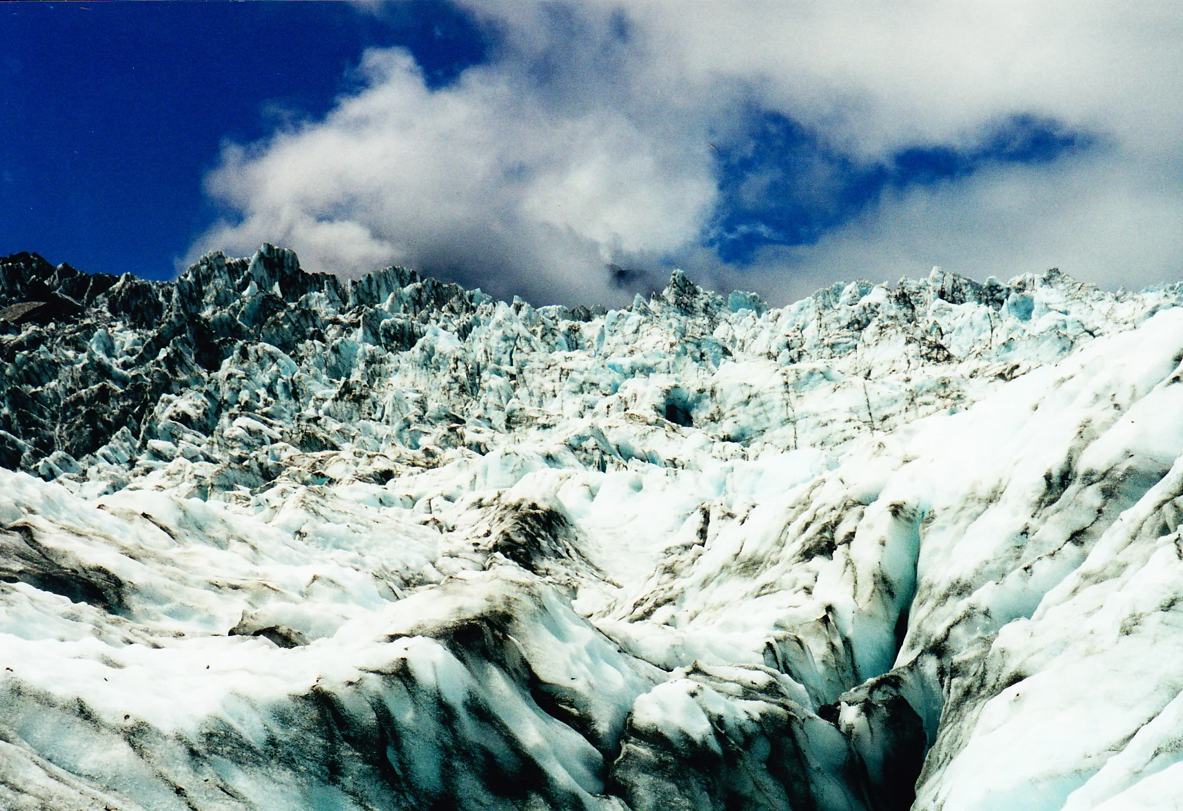 I continued south and finally made the Westcoast. Here the coastline sort of reminded me of Ireland. Mountains on my left, the sea on the right, and green farm land in between with lots and lots and lots of sheep. I stopped for lunch in a town called Hokitika, which is well known for its greenstone (jade) carvings. Then it was back in the car and again south along the coast towards my destination, the Franz Joseph Glacier. I made it to Franz Joseph about 230PM and I was wiped out. I had started driving at 730AM and had pushed pretty hard. Then I needed to arrange my glacier hike. There are two glaciers here, Franz Joseph and the Fox Glacier, separated by about 30kms. While I was staying in Franz, I decided to hike Fox. The book said that it was the easier to hike. (Please remember this point).