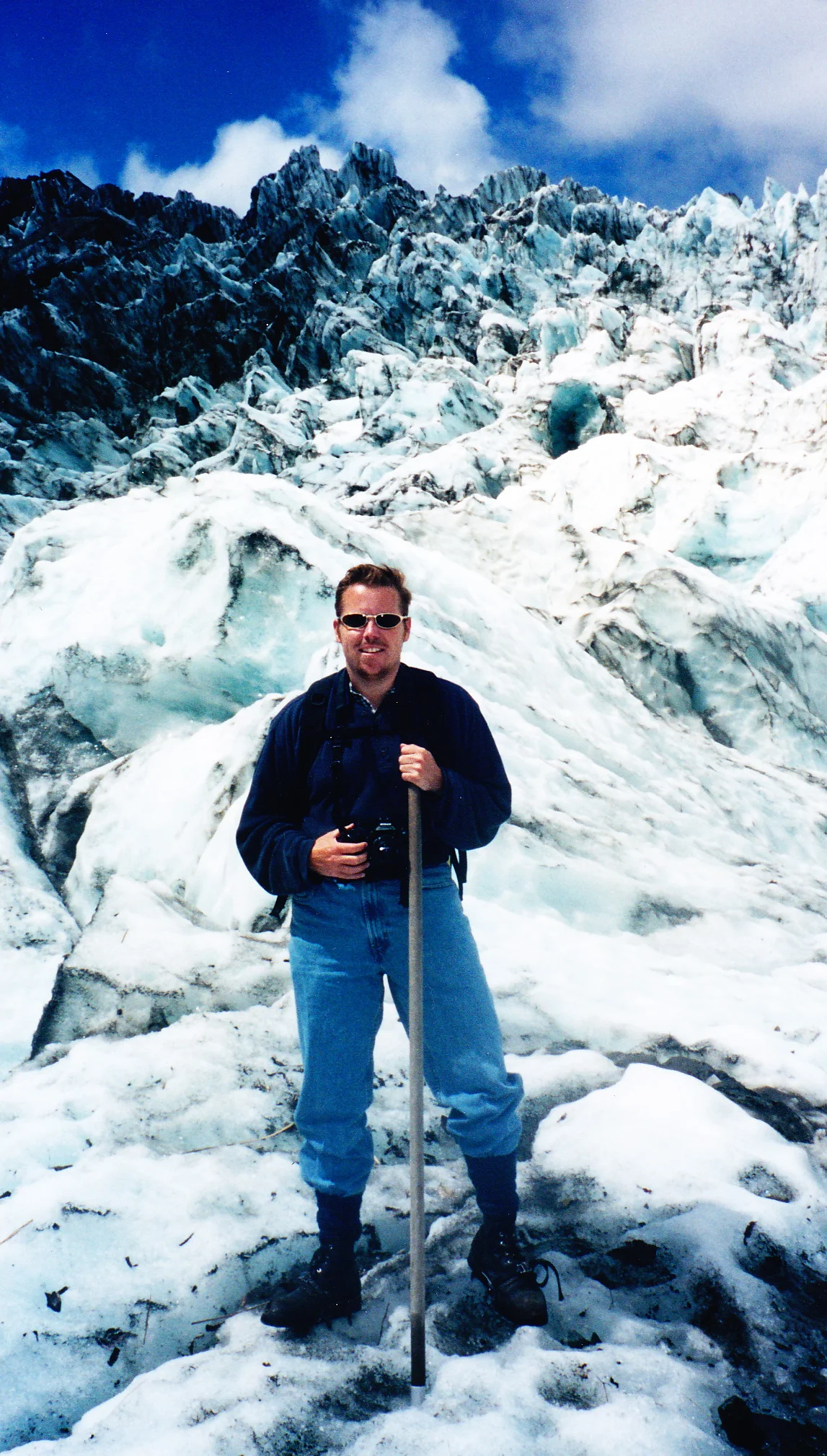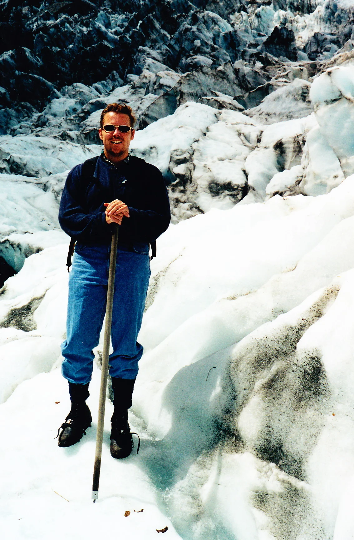 So the next day I'm up early and head south to the Fox Glacier. While it is only 20kms, it takes about 30-45 minutes to drive since the road is very twisty. I arrive at the operations base of Alpine Guides where it appears that my boots aren't going to cut it. The crampons need a groove behind the heel, which mine doesn't have, or it will cut into the leather. So I change boots and grab a rain jacket as well even though it is sunny outside. Hauling a jacket up on the glacier is the best form of insurance against bad weather. Fox and Franz Joseph are 2 of only 3 temperate glaciers in the world. The other is the Perrito Morreno glacier in Patagonia, which I have actually ice hiked on. Let's reflect on that a bit shall we. In Patagonia, the bus picked us up for a quick 10 minute ride to the lake. Then it was a 20 minute boat ride across the lake to the glacier, and then a short 5 minute walk to the glacier terminal. Okay, that was Patagonia, that's not New Zealand. Oh we board a bus for a 10 minute ride, but then we need to hike up the valley to get to the glacier terminal. The key word here is UP. And I mean UP, UP, UP, and UP!! We start walking UP the side of the valley. We leave the boulders and enter part of the forest wwhich is a temperate rain forest. It's a bit damp as we continue walking UP the hill. There are parts where they have put narrow boards across the small streams for us to cross and sometimes we are actually walking UP some small streams basically hopping from wet rock to wwet rock. It's quite a little goat trail we are on. Then the goat trail ends and there is an aluminum ladder for us to climb UP to catch the next goat trail. Here the guide asks us to hold onto the chain on the side of the mountain as the trail narrows a bit and there is a 120m drop just to our right. So we continue UP. Now I know you are thinking, "Oh Trey, he's just exaggerating how far UP he really climbed." Okay bite me. At our highest part on the trail (not the glacier mind you) it was over 580m (1m=3.3 ft). Do the math. Oh and this was all in less than an hour. Was Trey feeling the burn? Oh (insert expletive) yes. But we were finally at the glacier. We put out crampons on and started up (surprise!) the glacier. It was a bit dirtier that the one in Patagonia, but just as fascinating. The glacier had carved out a huge valley and was in the process of retreating, so there was quite a bit of water running off the glacier. We climbed . . . and climbed. The weather was very good and the different colors of blue in the ice just amazing. We hike for about an hour and then stopped for the lunch we all had brought.